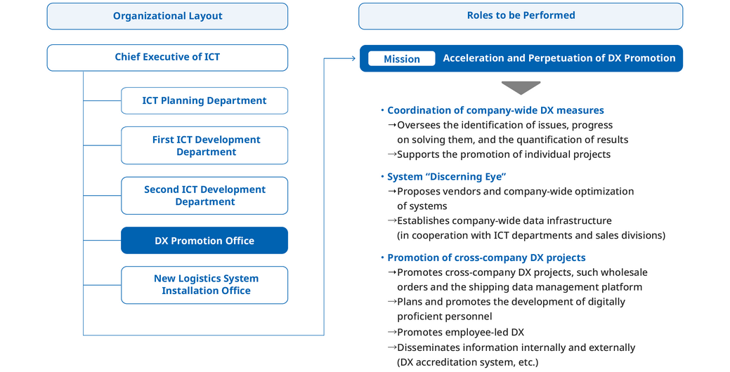 The DX Promotion Office is responsible for coordinating DX measures at the company and acting as a “discerning eye” for systems to accelerate and perpetuate the promotion of DX.