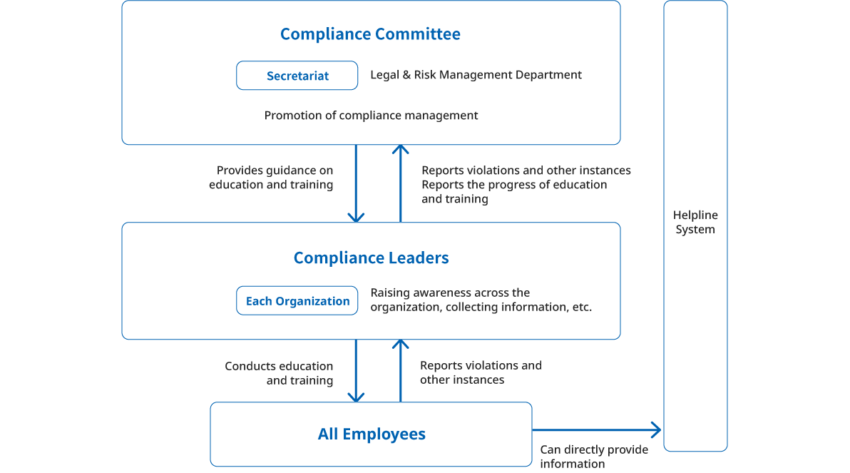 We have established a helpline through which every employee can report to the secretariat of the Compliance Committee (Legal & Compliance Department) or external institutions. The purpose of this initiative is to identify compliance issues, including instances of injustice and harassment, at an early stage and address them.