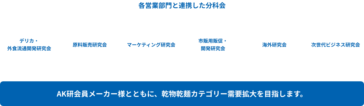 乾物乾麺市場規模は縮小傾向にあり、原料事情も厳しい中、生産・消費の両面で専門組織体制を確立し、展示会や企画提案・売場提案や業界の発展に寄与するべく「アクセス乾物乾麺市場開発研究会」(AK研)を設立。日本の乾物乾麺市場の発展に寄与するとともに日本の食文化を守り、継承してまいります。