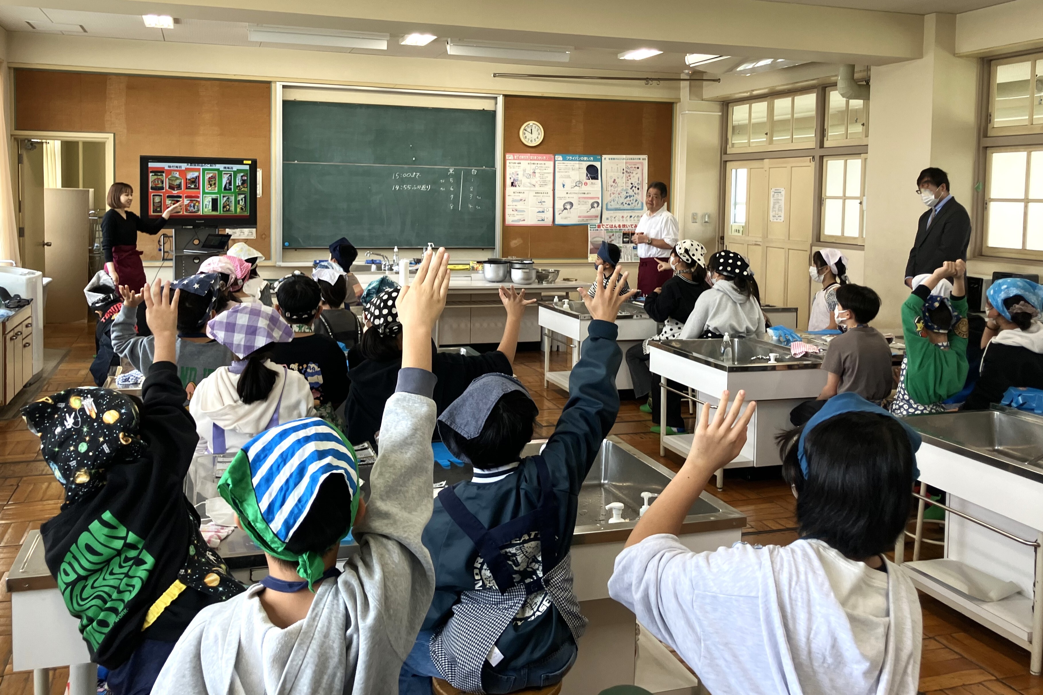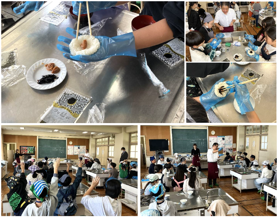 2時間目は、海苔・ふりかけ・お茶漬け・スープなどの製造と販売を行う株式会社大森屋様を講師に迎え、「海苔」をテーマに前半は「海苔」が出来るまでや養殖方法、栄養について学び、後半は、ごはんソムリエの資格を持つ河野様によるおにぎりづくりの実演を行いました。児童たちは大森屋様が運営するおむすび専門店「のり結び 京都寺町店」(京都市中京区)で販売されている海苔を使って、ふっくら美味しいおにぎりづくりを体験しました。