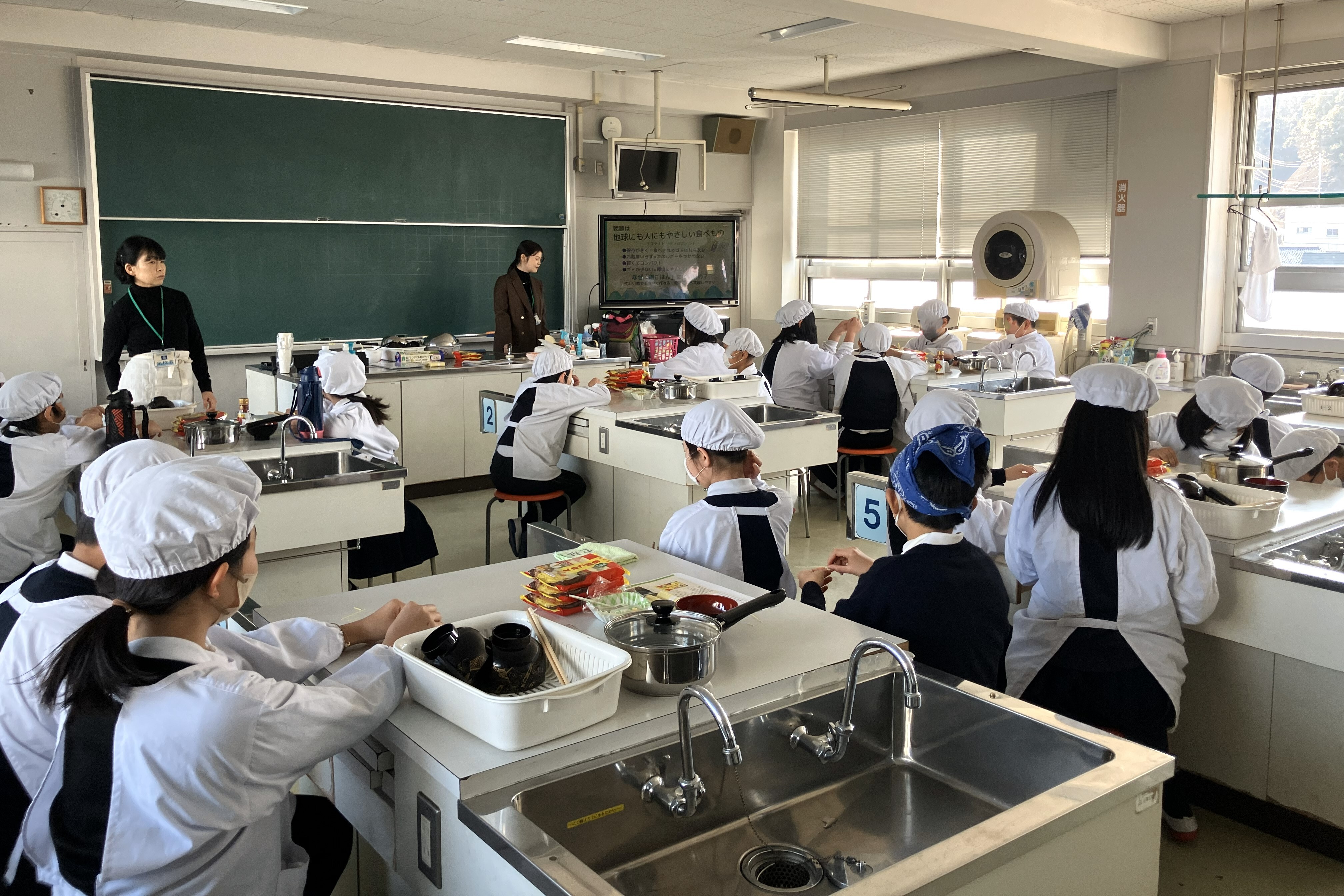 授業では、うどん・そうめん・そば・中華麺・ひやむぎ等の乾麺全般および揖保乃糸を製造・販売する田靡(たなびき)製麺株式会社様を講師に迎え、「乾麺」をテーマに前半は「乾麺」の有用性をサステナビリティの観点を含めて学び、後半は、忙しい朝でもパパッとつくれる「乾麺」を使った朝ごはんのレシピとして「かきたま中華スープ麺」を紹介し、実際に調理体験をおこないました。