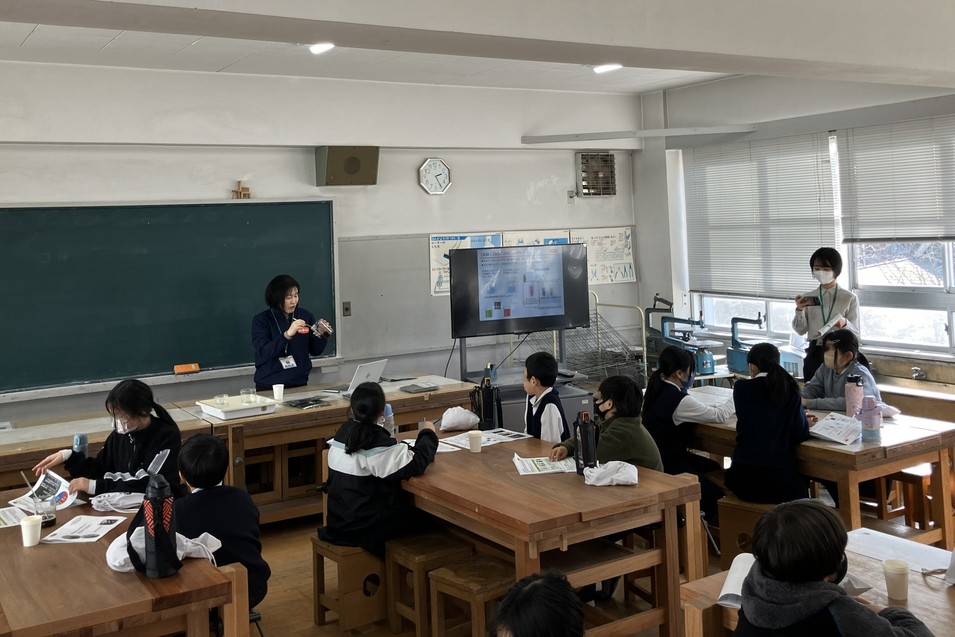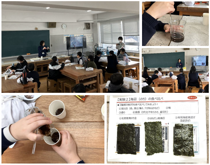 授業では、海苔加工品等の製造および販売をおこなう株式会社白子様を講師に迎え、「海苔」をテーマに前半は「海苔」がいつから食べられているか、どこで採れるのか、その養殖方法、栄養成分など、「海苔」の基本について説明しました。後半は「海苔は何色か?」と題して水の入ったビーカーに乾海苔(ほしのり)を入れてかき混ぜ、色素の抽出をおこない、海苔の色について知る実験を行いました。児童たちは色の変化に歓声をあげながら海苔への興味を深めていました。また、同社の焼のり3種類(佐賀産焼のり金、はねだし焼き海苔、有明海産青混ぜ)の食べ比べも実施し、見た目や味、香り、歯切れなどの食感の違いを体験しました。